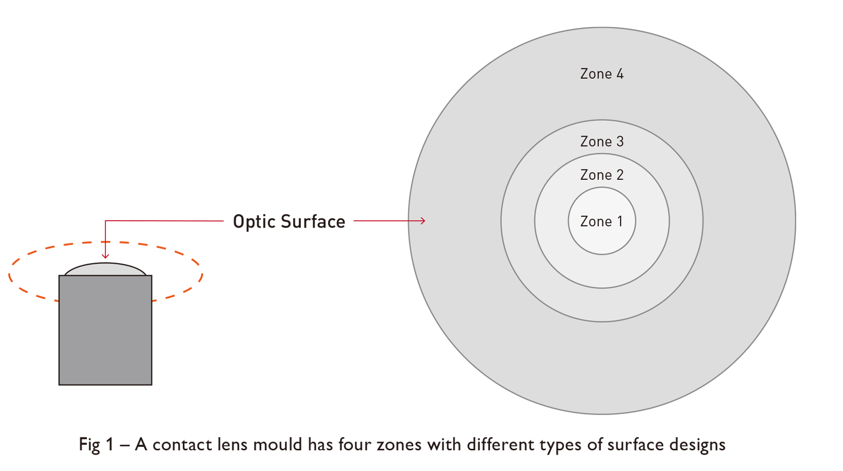 这是一个环焦面隐形眼镜模仁, 按照面形设计的不同, 分为4个区域。