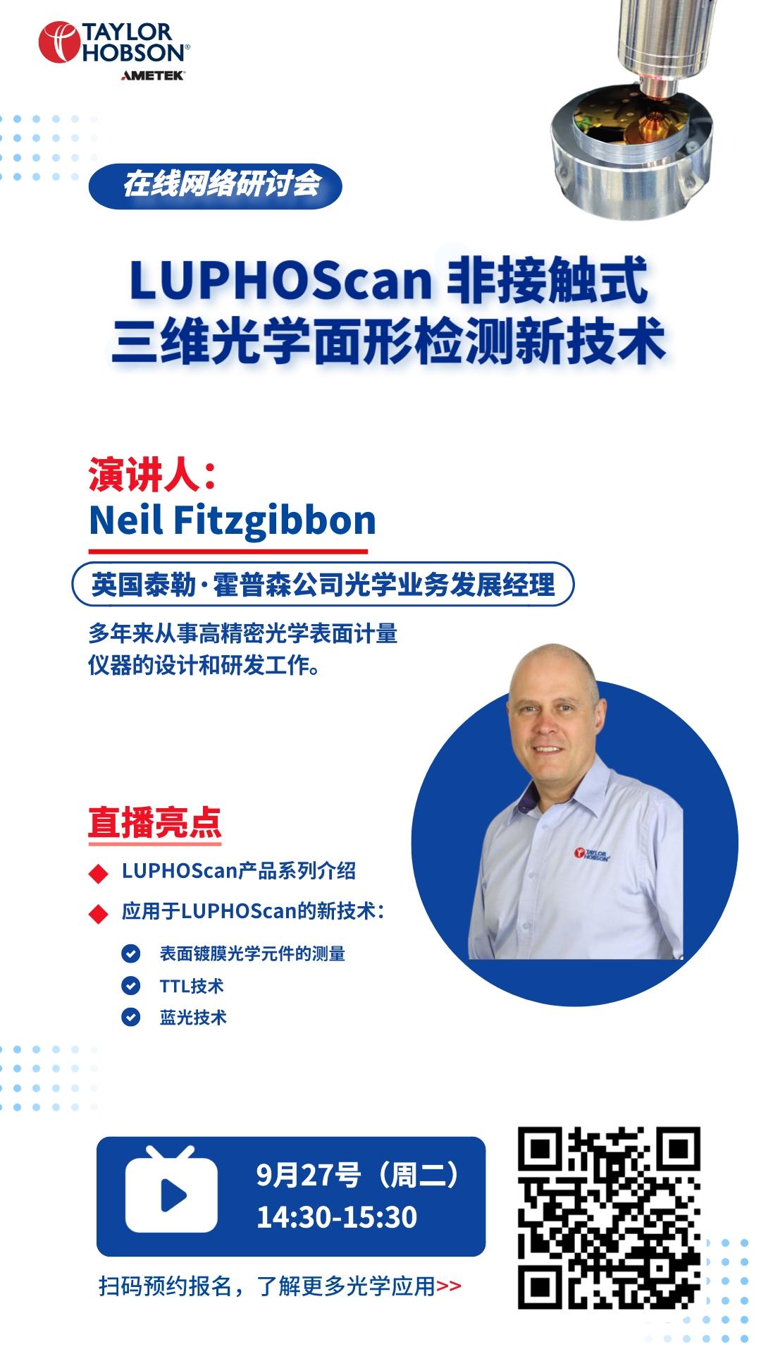 LUPHOScan 测量平台自2012年面世以来,凭借泰勒‧霍普森130多年的技术底蕴和十年来的不断耕耘,帮助精密光学元件制造商提升质量控制,得到广大用户的肯定和支持! 借此时刻,我们向广大新老朋友表示诚挚的谢意,并跟大家分享我们的最新技术成果。 英国泰勒·霍普森公司光学业务发展经理Neil Fitzgibbon将为您带来LUPHOScan非接触式三维光学面形检测新技术网络研讨会。